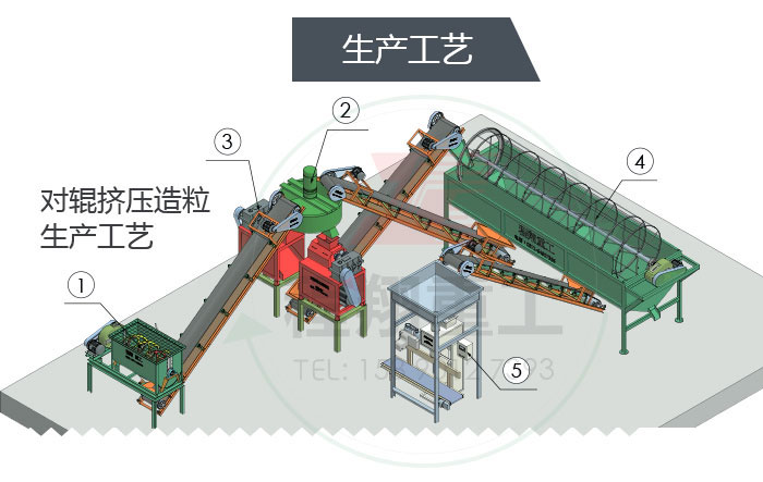 ① 臥式攪拌機(jī) ② 盤(pán)式喂料機(jī) ③ 對(duì)輥擠壓造粒機(jī) ④ 滾筒篩分機(jī) ⑤ 自動(dòng)包裝秤