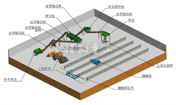 方案二:鏟車+翻堆機+皮帶輸送機+篩分機+破碎機