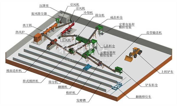 粒狀有機肥料生產(chǎn)線所需設(shè)備一般有:1)鏟車、2)翻堆機、3)定量給料震動料倉、4)粉碎機、5)滾筒篩分機、6)皮帶輸送機、7)電子動態(tài)配料稱(可選)、8)混合攪拌機、9)造粒機、10)滾筒烘干機、11)滾筒式冷卻機、12)噴漿包膜機(可選)、13)自動定量包裝機