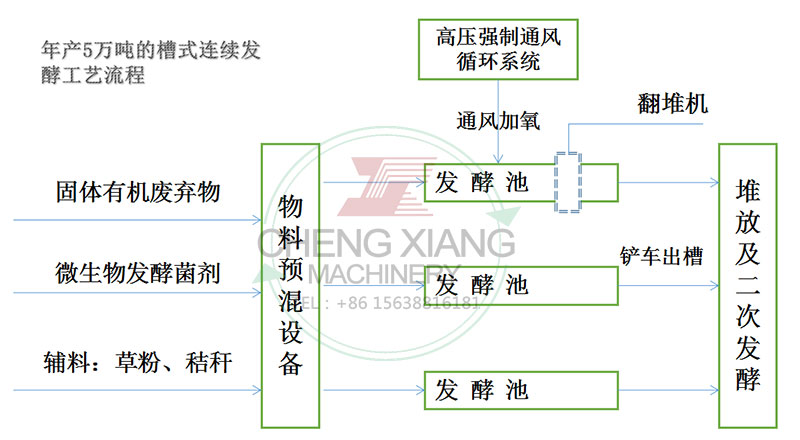 如工藝流程圖所示,每天將畜禽糞便等固體有機廢棄物與秸稈等輔料混合物及發(fā)酵菌劑充分混合,用鏟車均勻地送入發(fā)酵池前端(原始空池前端1/8或翻倒完騰出的池前端1/8),發(fā)酵物料在池內(nèi)堆積厚度為1.5~1.8米,靠高壓風機強制通風和翻堆時物料與空氣接觸提供的氧氣進行連續(xù)好氧發(fā)酵,使發(fā)酵物料快速腐熟、去水、干燥,發(fā)酵周期7-8天。在翻堆機縱橫向行走機構(gòu)的運送下,垂直提升機構(gòu)將發(fā)酵物料從池內(nèi)挖起提升到水平輸送機構(gòu)上,水平輸送機構(gòu)將發(fā)酵物料輸送一段距離(8-10米)后落入池中,這樣發(fā)酵物料就在池內(nèi)產(chǎn)生一定的位移,使物料在池內(nèi)有規(guī)律、等距離的漸進式后移,每天從發(fā)酵池尾端將發(fā)酵好的物料(一天的處理量,池長的1/8)用鏟車運走,將發(fā)酵池前端騰出的空間(一天的處理量,池長的1/8)補充新的發(fā)酵物料,從而形成了一種連續(xù)的發(fā)酵過程。發(fā)酵翻堆過程實現(xiàn)了全自動智能化控制。發(fā)酵后的物料堆成料堆儲存的同時進行二次發(fā)酵,進一步腐熟并去除部分水分。堆制一段時間(根據(jù)生產(chǎn)任務(wù)及場地決定)后對其進行篩選、磁選去除其中的石塊、鐵件等,調(diào)整水分(曬干或烘干)即可作為粉狀有機肥銷售或用作有機肥造粒原料。