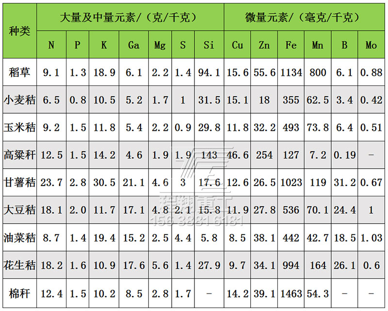 秸稈中含有大量的有機(jī)質(zhì)和氮(N)、磷(P)、鉀(K)、鈣(Ca)、鎂(Mg)、硫(S)、硅(Si)、銅(Cu)、錳(Mn)、鋅(Zn)、鐵(Fe)、鉬(Mo)等營(yíng)養(yǎng)元素,主要作物秸稈的營(yíng)養(yǎng)元素含量見(jiàn)表1。