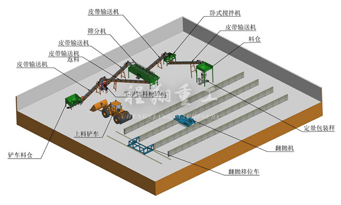 本次牛糞全套有機(jī)肥料設(shè)備生產(chǎn)工藝采用槽式好氧發(fā)酵,利用翻堆槽發(fā)酵既干凈又能最大化的利用有限的場地,增加糞便處理量。由于客戶對于顆粒有機(jī)質(zhì)含量以及NPK有特殊要求,因此我們?yōu)榭蛻魧iT定制了一臺三倉的靜態(tài)配料系統(tǒng)。