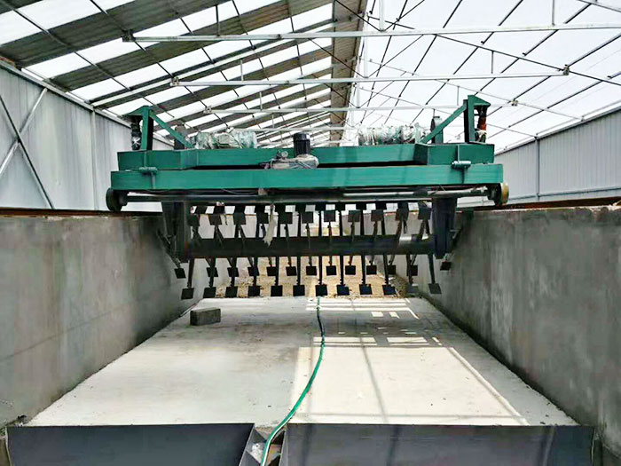 ②方法:發(fā)酵槽堆肥基本由四部分組成:發(fā)酵槽、攪拌機(jī)械、通氣裝置和發(fā)酵大棚(車間)。使用通氣裝置可以加快發(fā)酵速度,但是耗電量大,有些發(fā)酵槽堆肥不用通氣裝置,只通過(guò)攪拌來(lái)提供氧氣二發(fā)酵槽的形式有跑道形、直線形、圓形,目前市場(chǎng)上大部分為直線形,長(zhǎng)40~50米,為了提高設(shè)備利用率,提高處理量,大都采用并聯(lián)式發(fā)酵槽,一般為2~4個(gè)槽,最多可達(dá)6個(gè)槽,共用1套攪拌機(jī)械,用1臺(tái)移行車實(shí)現(xiàn)攪拌機(jī)構(gòu)在槽與槽之間的移動(dòng)。在堆肥過(guò)程中,攪拌機(jī)構(gòu)在發(fā)酵槽的軌道上移動(dòng),從入口端移到出口端,把糞便完整地?cái)嚢枰槐?,同時(shí)把糞便向出口端推移一定距離,再?gòu)某隹诙朔祷兀绱斯潭鴱?fù)始,最終完成發(fā)酵過(guò)程。